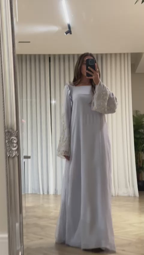 Featuring a structured square neckline and wide, flared sleeves embellished with delicate embroidery and textured floral details, this piece brings a soft yet luxurious charm to your wardrobe.